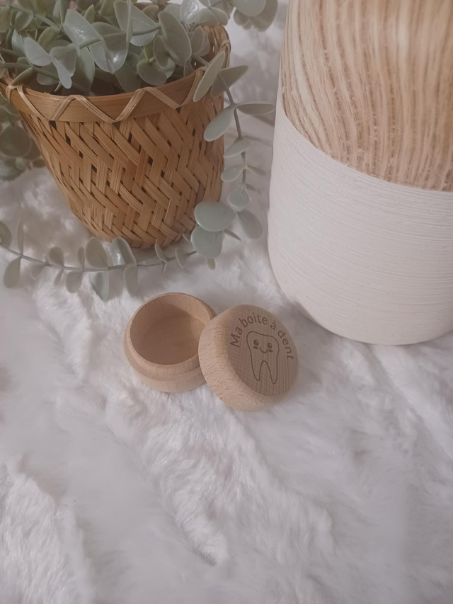 Offrez à votre enfant un écrin unique pour conserver ses précieuses dents de lait avec cette adorable boîte à dents en bois. Gravée avec l'inscription "Ma boîte à dents" et un mignon dessin de dent souriante, elle deviendra un souvenir précieux de son enfance.