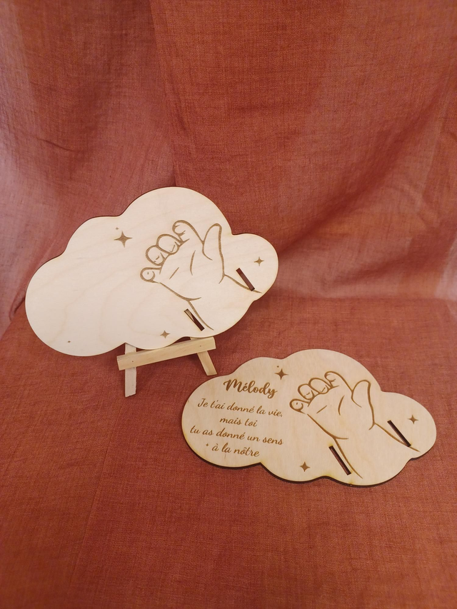 Offrez un cadeau unique pour célébrer l'arrivée d'un nouveau-né avec notre décoration en bois de 16 cm x 10 cm x 3 mm spécialement conçue pour accueillir un bracelet de naissance.