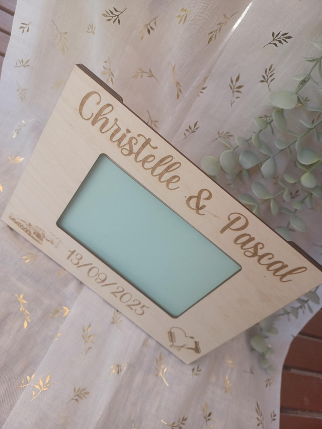 Offrez un souvenir unique et intemporel avec ce cadre photo en bois personnalisé 💍. Gravé avec les prénoms des mariés et leur date de mariage, il mettra en valeur la plus belle photo de cette journée inoubliable.