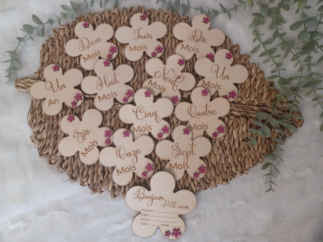 Ce set de 13 cartes étapes comprend un carte "Bonjour" laissant ainsi les parents marquer les informations clés de la naissance et 12 cartes en forme de fleurs, chacune gravé avec un mois de la première année pour créer de magnifiques photos souvenirs.