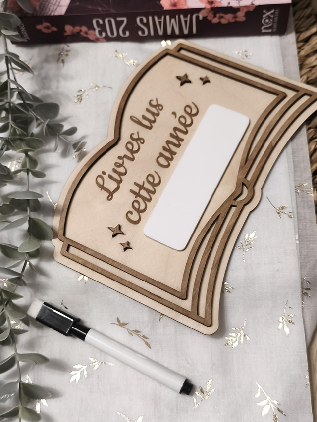 Composé de plusieurs couches de bois gravé, d'un stylo effaçable et d’une plaque en acrylique, il permet de noter au fur et à mesure le nombre de livres lus.