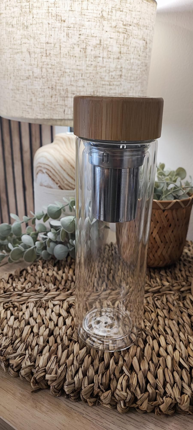 Cette élégante bouteille est conçue en verre borosilicate de haute qualité, ce qui la rend résistante aux chocs thermiques. Son design épuré met en valeur un couvercle en bambou naturel, délicatement gravé.