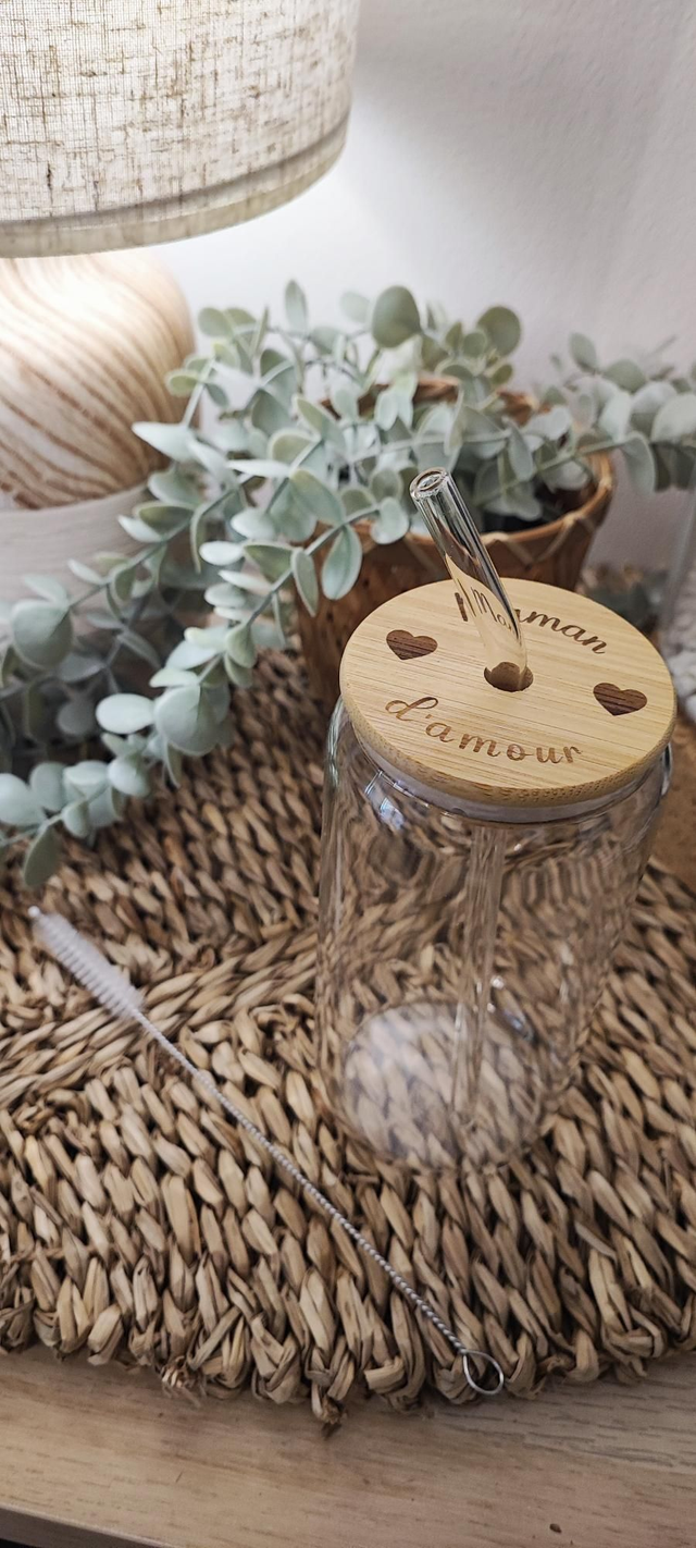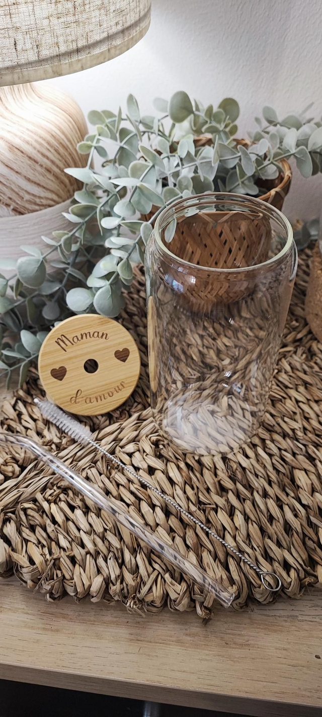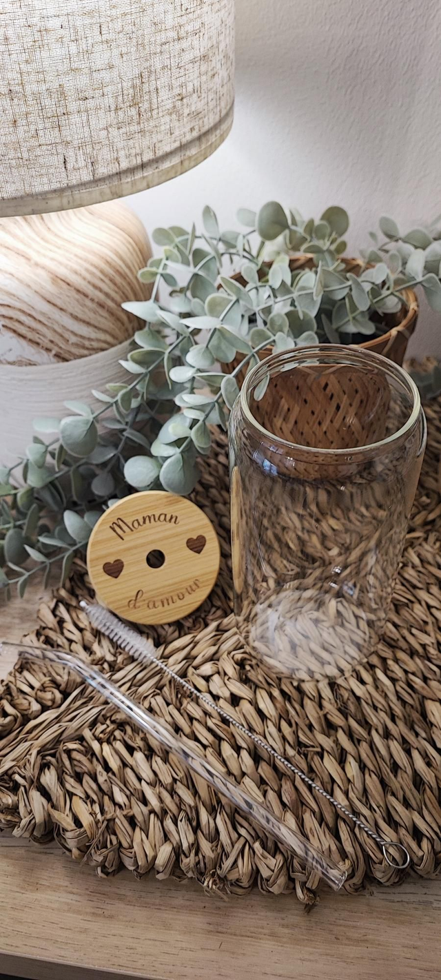 Craquez pour notre adorable verre ! 💖 Avec son couvercle en bambou gravé et sa paille en verre, il est parfait pour savourer vos boissons préférées avec style et une touche de tendresse. Idéal pour offrir ou se faire plaisir ! ✨