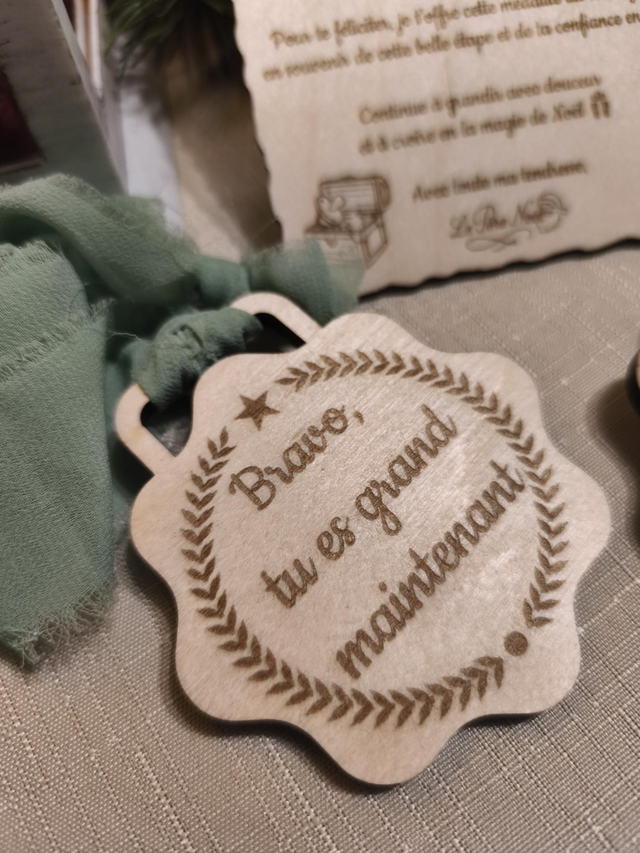 Cette jolie lettre gravée sur bois est personnalisée avec le prénom de votre enfant et accompagnée d’une médaille “Bravo tu es grand maintenant”, symbole de fierté et de tendresse
