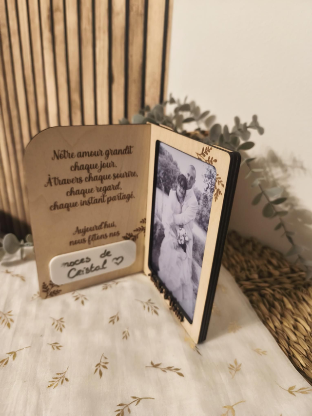 Cette création unique en bois comme un livre révèle, d’un côté, une photo pleine d’émotion, et de l’autre, un texte gravé avec soin, accompagné d’un prénom, d’une date ou d’un message personnalisé.