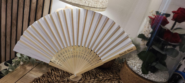 Alliez élégance et praticité avec cet éventail artisanal en bois clair orné de délicates feuilles en papier blanc. Léger et compact, il se glisse facilement dans un sac pour vous accompagner partout, offrant une brise agréable lors des journées chaudes. Son design sobre et raffiné en fait aussi un accessoire pour mariages, cérémonies et événements estivaux.