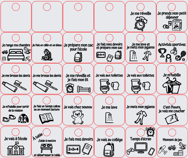 - 26 pictogrammes de tâches quotidiennes (évolutif avec les années) à effectuer et 4 vierges pour créer votre propre routine