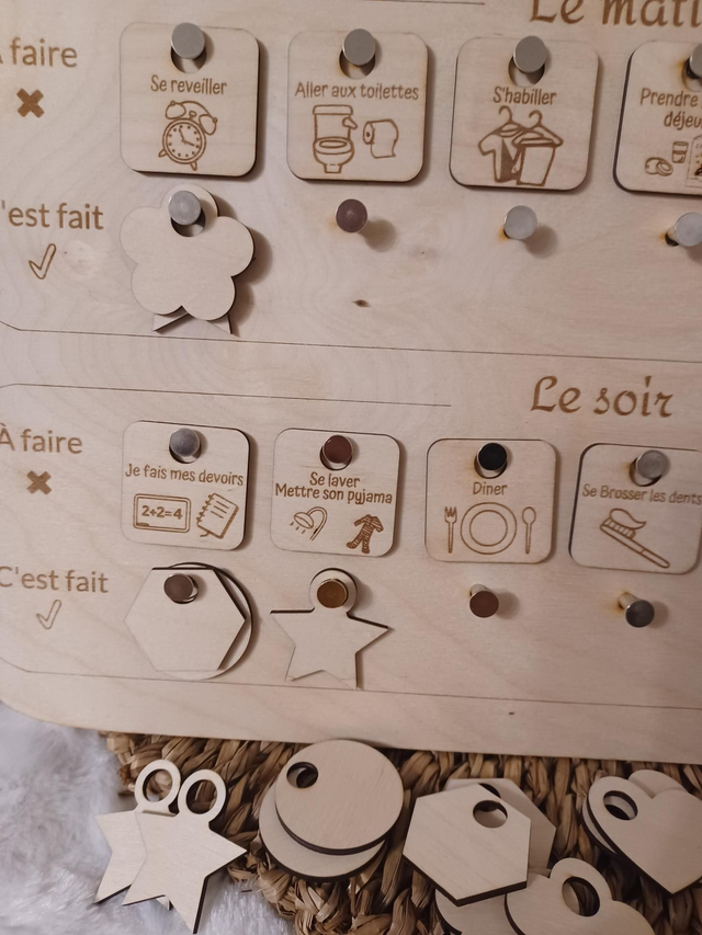 - 26 pictogrammes de tâches quotidiennes (évolutif avec les années) à effectuer et 4 vierges pour créer votre propre routine