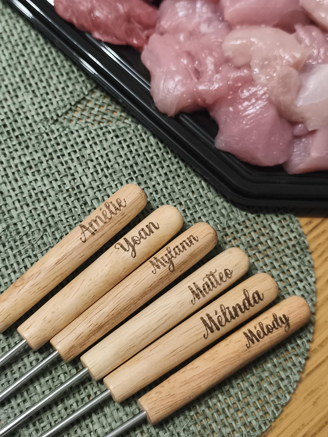 Chaque manche en bois est gravé avec le prénom de votre choix, ou une phrase rigolote pour que chacun reconnaisse facilement sa fourchette autour de la table.