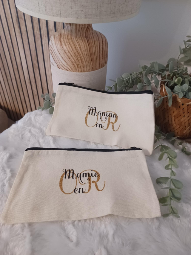 Offrez un cadeau tendre et pratique avec cette pochette en tissu personnalisée “... en Or”. Confectionnée avec soin dans un tissu doux et résistant, elle est ornée d’une inscription floquée au choix : Mamie en Or, Maman en Or, ou toute autre personnalisation qui fera briller le cœur de son destinataire.