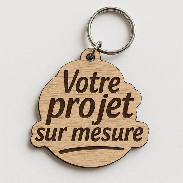Chaque porte-clé est gravé puis découpé avec précision dans mon atelier en Haute-Savoie, pour un rendu soigné et durable.