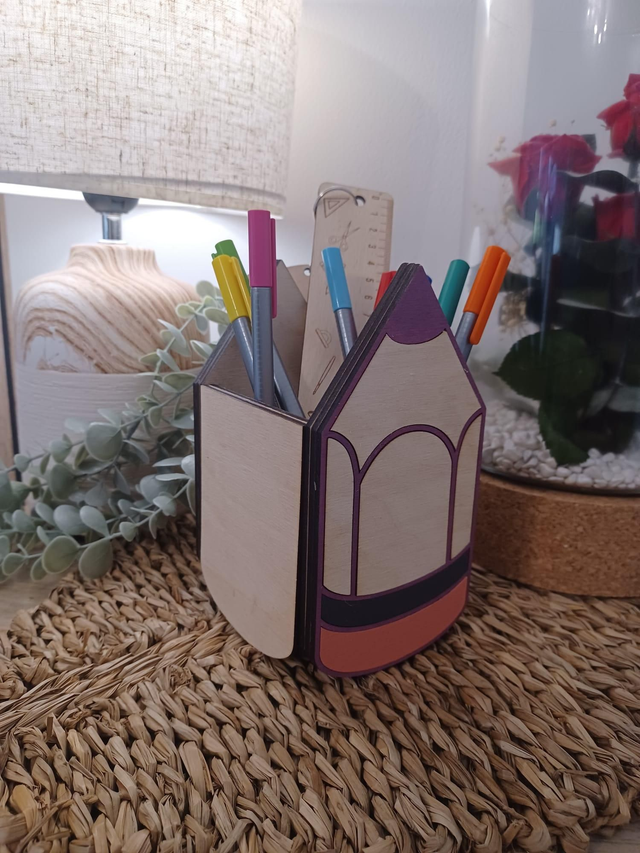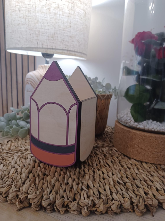 Ce pot à crayons en bois, en forme de crayon stylisée, est parfait pour organiser stylos, feutres, ciseaux et règles tout en ajoutant une touche chaleureuse au bureau ou à la classe.