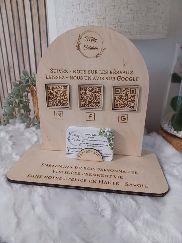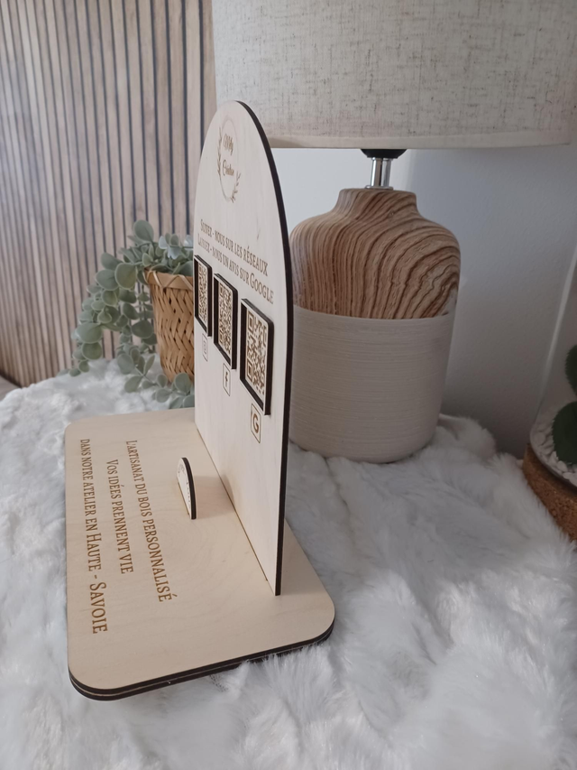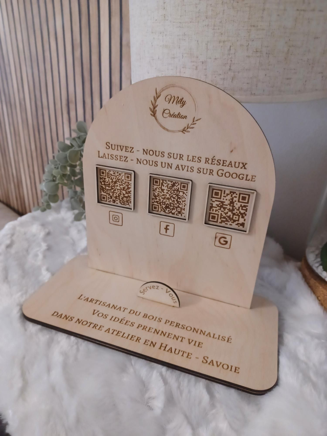 Présentoir en bois personnalisable avec 1/2/3 QR Codes – Réseaux sociaux & Avis Google
