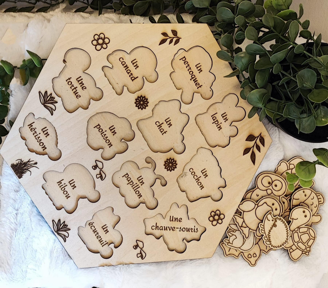 Puzzle Éducatif en Bois – Animaux Gravés avec Noms