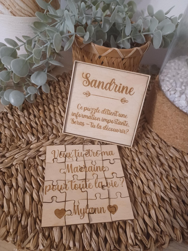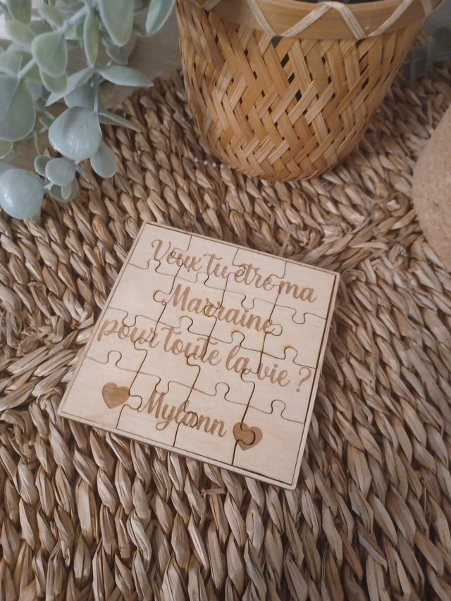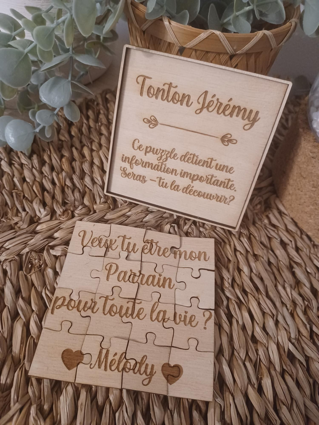 Que vous souhaitiez demander à un proche de devenir le parrain ou la marraine de votre enfant, annoncer une grossesse, ou faire une demande de témoin, ce puzzle gravé est idéal. Le destinataire devra assembler les pièces pour découvrir le message que vous lui réservez, suspense et joie garantis ! Bien plus qu'un simple message, c'est un souvenir précieux