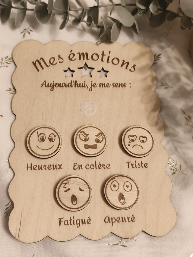 Ce tableau des émotions en bois, en forme de petit biscuit, accompagne les enfants dès 3 ans pour identifier, nommer et communiquer leurs émotions au quotidien. Grâce aux pastilles amovibles, l’enfant choisit l’émotion qui correspond à son ressenti du moment, favorisant l’échange et l’apaisement.